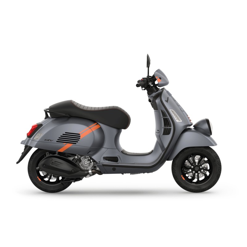 Die Vespa Gtv verbindet die Authentizität der Vergangenheit mit kühnen und zeitgemäßen Details. Die matten Farben mit kontrastreichen Grafiken betonen seinen sportlichen und modernen Charakter, während der Sattel im Rennsitzer-Look für einen Hauch von Exklusivität sorgen. Der Scheinwerfer in niedriger Position und der sichtbare Lenker, eine Hommage an das Erbe von Vespa, signieren das ikonische Design der Vespa Gtv, ebenso wie die unvergleichliche "Krawatte" in der Mitte des Schildes.